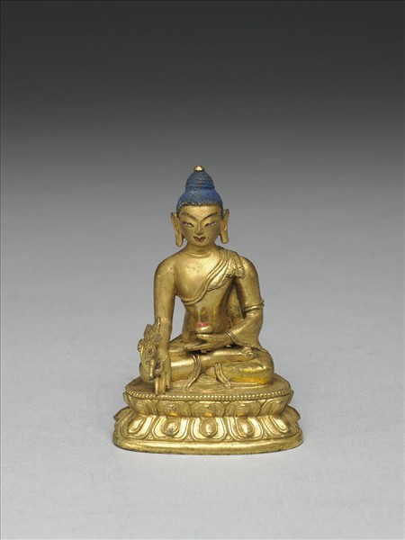 銅鎏金佛坐像,結跏跌坐於蓮座上,左手持缽,右手持樹枝,面容秀氣平和,面帶微笑;肌理圓潤均勻,著右袒式袈裟,衣袖、下襬寬鬆,與中國服裝寬袍大袖的風格相近。底陰刻十字杵花紋,置於瓷製藏式塔龕內。