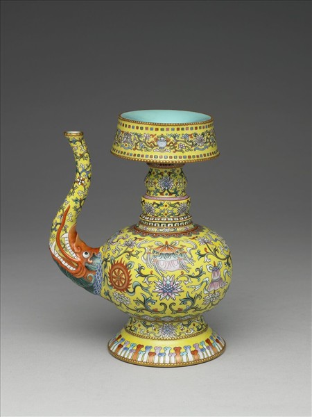 瓷胎,侈口,器頂形如平台傘蓋狀,階式頸,圓腹,曲流,圈足外撇。器內湖綠色,器壁黃地,繪五彩圖紋,以轉枝番蓮紋為主,腹部及傘蓋處飾佛教八寶:寶瓶,寶傘,白蓋,盤長,金魚,法螺,蓮花,法輪,腹部下緣及圈足飾一圈花瓣紋;流底部以龍首為飾,全器圖紋皆描邊。口沿、圈足邊緣有金色連珠紋為飾。足底呈褐色,器底為湖綠色,中央有白地紅書「大清乾隆年製」六字三行篆書款。