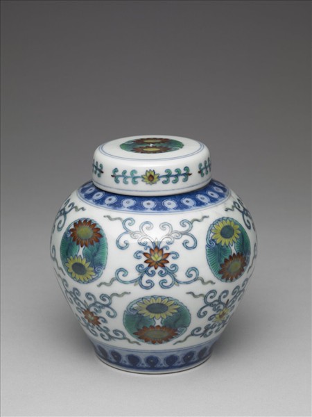 斂圓口,短頸,豐肩,腹部上碩下斂,平底凹足,帶平頂圓蓋。器肩及底邊各繪青花朵花紋飾一周,花心加點紅、黃點紋,罐腹上下各繪飾四團花菊紋、隙地則飾蓮花。蓋面亦飾團菊花卉,蓋周則為四組蓮花紋。底青花書「大清乾隆年製」六字三行篆款。