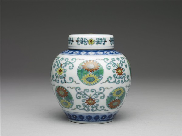 斂圓口,短頸,豐肩,腹部上碩下斂,平底凹足,帶平頂圓蓋。器肩及底邊各繪青花朵花紋飾一周,花心加點紅、黃點紋,罐腹上下各繪飾四團花菊紋、隙地則飾蓮花。蓋面亦飾團菊花卉,蓋周則為四組蓮花紋。底青花書「大清乾隆年製」六字三行篆款。
