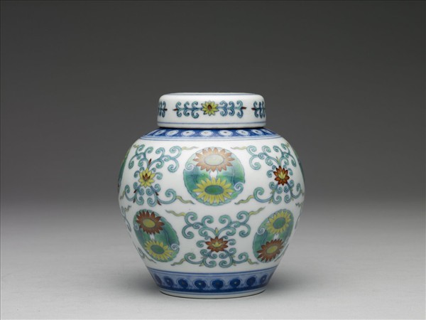 斂圓口,短頸,豐肩,腹部上碩下斂,平底凹足,帶平頂圓蓋。器肩及底邊各繪青花朵花紋飾一周,花心加點紅、黃點紋,罐腹上下各繪飾四團花菊紋、隙地則飾蓮花。蓋面亦飾團菊花卉,蓋周則為四組蓮花紋。底青花書「大清乾隆年製」六字三行篆款。