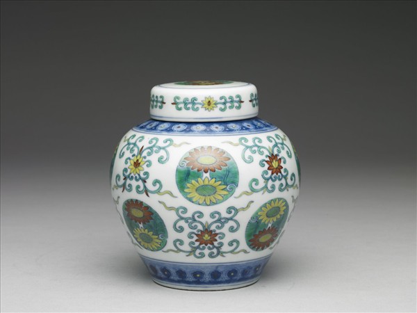斂圓口,短頸,豐肩,腹部上碩下斂,平底凹足,帶平頂圓蓋。器肩及底邊各繪青花朵花紋飾一周,花心加點紅、黃點紋,罐腹上下各繪飾四團花菊紋、隙地則飾蓮花。蓋面亦飾團菊花卉,蓋周則為四組蓮花紋。底青花書「大清乾隆年製」六字三行篆款。