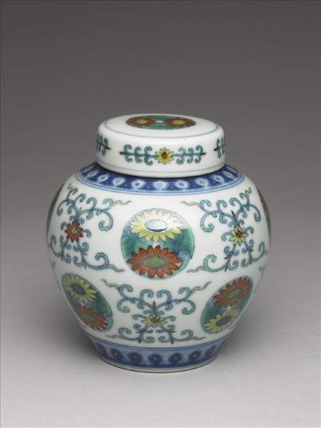 斂圓口,短頸,豐肩,腹部上碩下斂,平底凹足,帶平頂圓蓋。器肩及底邊各繪青花朵花紋飾一周,花心加點紅、黃點紋,罐腹上下各繪飾四團花菊紋、隙地則飾蓮花。蓋面亦飾團菊花卉,蓋周則為四組蓮花紋。底青花書「大清乾隆年製」六字三行篆款。