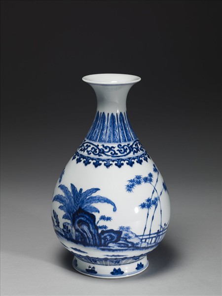侈口束頸,削肩碩腹,圈足。白地青花,頸飾蕉葉紋,頸腹交界處有捲草、如意雲頭紋各一圈。腹壁繪庭園一景,近足處有蓮瓣紋一圈,圈足外飾蓮花一圈。圈足內以青花書「大清乾隆年製」三行六字篆款。