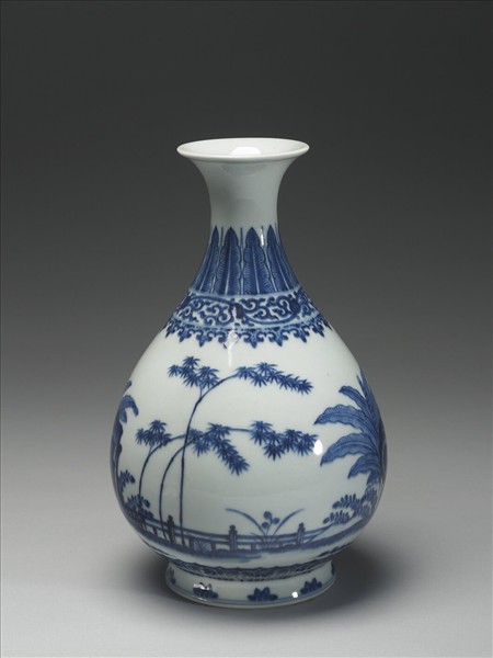 侈口束頸,削肩碩腹,圈足。白地青花,頸飾蕉葉紋,頸腹交界處有捲草、如意雲頭紋各一圈。腹壁繪庭園一景,近足處有蓮瓣紋一圈,圈足外飾蓮花一圈。圈足內以青花書「大清乾隆年製」三行六字篆款。