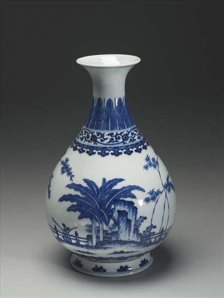 侈口束頸,削肩碩腹,圈足。白地青花,頸飾蕉葉紋,頸腹交界處有捲草、如意雲頭紋各一圈。腹壁繪庭園一景,近足處有蓮瓣紋一圈,圈足外飾蓮花一圈。圈足內以青花書「大清乾隆年製」三行六字篆款。