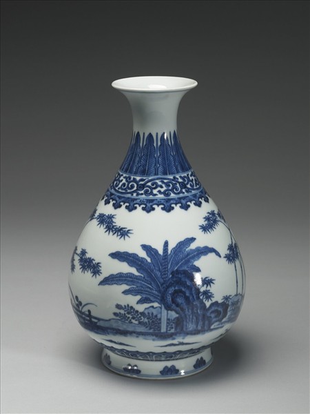 侈口束頸,削肩碩腹,圈足。白地青花,頸飾蕉葉紋,頸腹交界處有捲草、如意雲頭紋各一圈。腹壁繪庭園一景,近足處有蓮瓣紋一圈,圈足外飾蓮花一圈。圈足內以青花書「大清乾隆年製」三行六字篆款。
