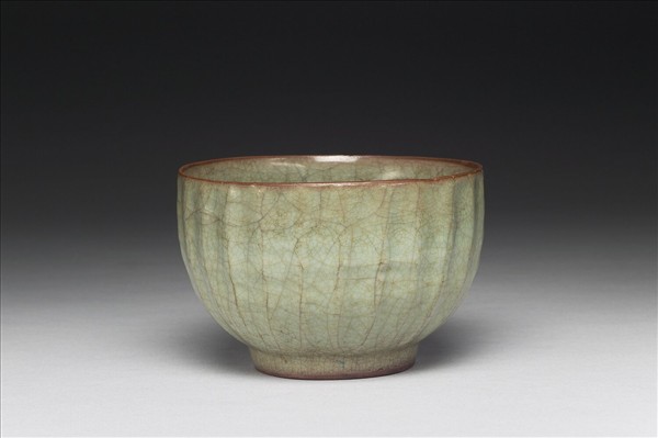 圓口,直壁下斂,圈足。周壁棱起次序相間形如菊瓣。器施青釉,滿布棕色及淡茶色細碎開片紋。圈足內滿釉,露胎一圈塗褐色汁。