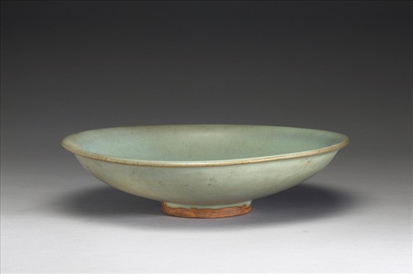 口沿外翻成一唇邊,弧形壁,平底,淺圈足。通體罩施月白色釉,釉色青中帶灰施釉至足際,口沿一道米黃邊,足外壁、底緣與內周壁無釉處,皆露土色胎,外底釉面墨書「八十元」。