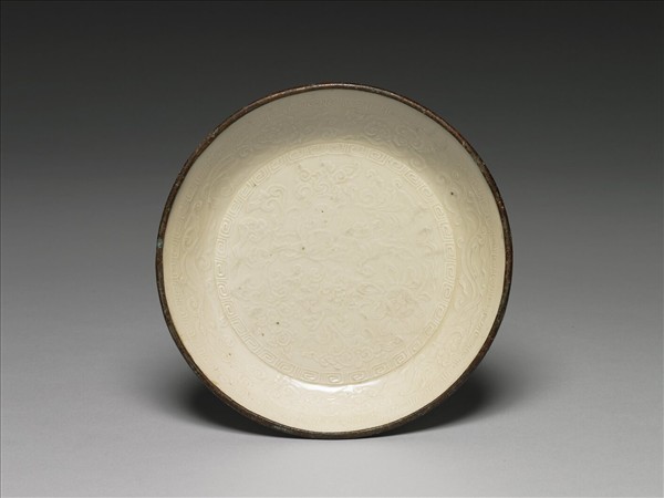 敞口淺盤,圈足。滿釉,釉色牙白,僅口緣無釉,鑲嵌銅棱釦。外壁光素,器裡印花:周壁為回紋及雲螭紋;內底以回紋周繞,中為奔跑的獅子與帛帶繡球,圖案結構精美,唯模較輕淺。
