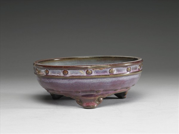 斂圓口,淺腹、腹形如鼓,平底,三足作雲頭形。口沿、腹壁各飾弦紋一道,鼓腹按飾鼓釘紋兩周;上緣十六枚,下緣十五枚。胎骨厚重,通體罩施葡萄紫釉,器內轉為灰藍色,釉面局部出現紫色斑點與蚯蚓走泥紋。施釉至底足,外底塗褐色護胎釉,周緣並有支燒痕十五枚,支點大小不一致。底刻數目字「八」。