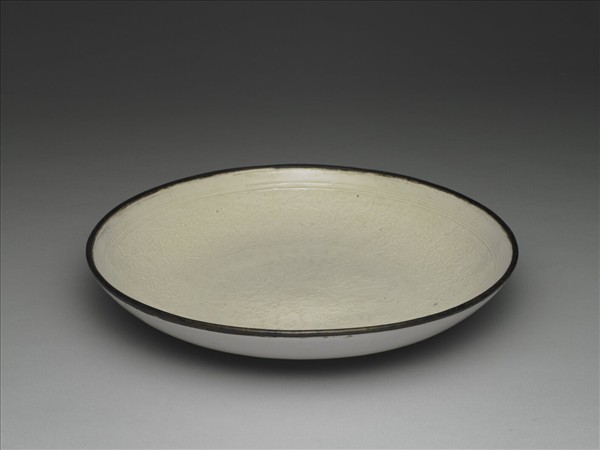 敞口,淺弧壁,圈足。器內外與圈足內底施米白色釉,足底露胎。口沿處鑲有一圈銅釦。器外壁光素無紋,內壁以印花技法裝飾各種圖案。器內口沿處飾兩道弦紋,腹壁滿飾花葉紋,碗心飾一圈回紋,內有各式花卉圖案。全器紋飾風格細膩精巧。