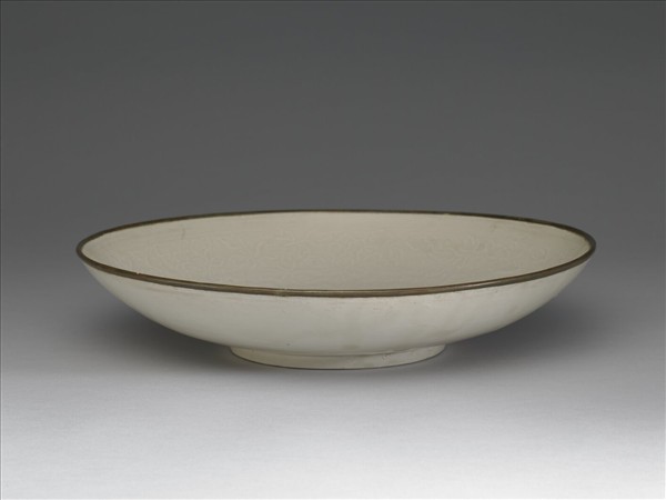 敞口,淺弧壁,圈足。器內外與圈足內底施米白色釉,足底露胎。口沿處鑲有一圈銅釦。器外壁光素無紋,內壁以印花技法裝飾各種圖案。器內口沿處飾兩道弦紋,腹壁滿飾花葉紋,碗心飾一圈回紋,內有各式花卉圖案。全器紋飾風格細膩精巧。