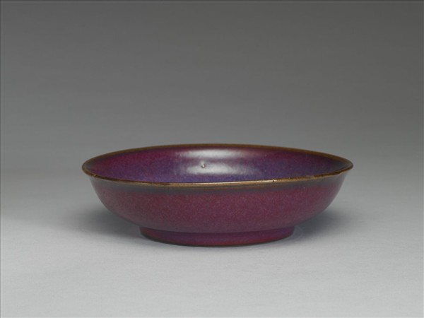 敞口唇沿,淺弧壁,圈足。全器內外壁施玫瑰紫釉,施釉至足際,口沿帶一道褐邊。足邊修釉齊整,圈足餘地露胎,並塗護胎汁。釉色有色階變化,外壁由上而下逐漸由紫色轉為酒紅,內壁則轉為丁香紫,饒富變化。