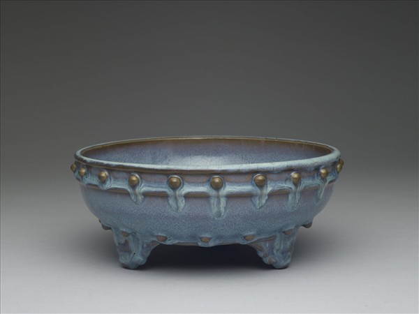 斂圓口,淺腹、腹形如鼓,平底,三足作雲頭形。口沿、腹壁各飾弦紋一道,鼓腹按飾鼓釘紋兩周;上緣二十枚,下緣十六枚。胎骨厚重,通體罩施月白色濃釉,釉質乳濁,釉表氣泡稯眼明顯。器內釉面有蚯蚓走泥紋,線條長而連續,邊稜呈褐色。施釉至底足,口下、足邊流汁低垂而下,外底塗褐色護胎釉,周緣有支燒痕二十四枚,支點大、排列密集。器底及一足內壁各刻數目字「五」,字跡拙劣。