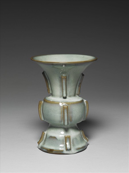 造型仿古銅器尊,口沿外敞,喇叭狀長頸接鼓腹,足脛外撇而下,矮圈足。器外頸、腹、足脛各裝飾突出的方棱四道。通體罩施月白色釉,釉層薄而不勻,釉色泛青,釉質乳濁,表面光亮,氣泡稯眼十分明顯。施釉至足際,足邊流之堆積,口沿及扉棱皆呈土黃邊。足底緣及足內凹圓底加塗醬色護胎釉,凹圓釉面局部出現藍彩,中心凸起一泥丸;足內印數目字「十」。