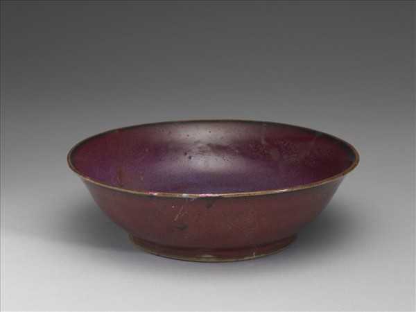 敞口唇沿,深弧壁,圈足。全器內外壁施玫瑰紫釉,施釉至足際,口沿帶一道褐邊。足邊修釉不甚齊整,圈足餘地露胎,並塗護胎汁。釉色有色階變化,外壁由上而下逐漸由紫色轉為酒紅。