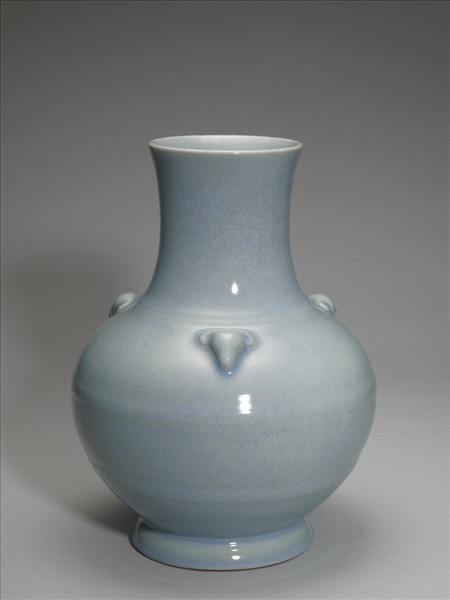 侈圓口,直頸,碩腹,圈足外撇。器之頸肩交界處有凹弦紋兩圈,弦紋下貼三羊首為飾。全器施天藍色釉,釉色藍中帶青,積釉處呈天藍色,釉層見有細碎之開片痕。底足緣露胎,足內施釉,釉下青花書「大清乾隆年製」三行六字篆款。