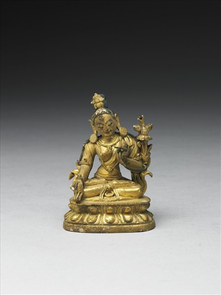 銅佛,綠髮高髻,長眉細眼,面帶微笑而向下俯視,頸纓絡,上身坦露,右手結與願印,左手曲起,持花一朵,花莖繞臂,盛開於肩側。身體微側坐於蓮座上。由其手印、持物看來,此或為白度母之造像。座底陰線刻十字杵紋。