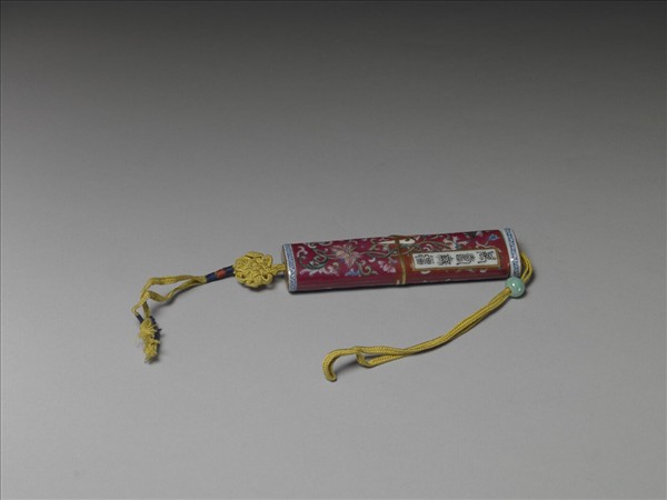 瓷牙籤筒,筒作扁圓形,中空以裝牙籤,外壁彩繪飾纏枝花卉圖樣。一端可打開為器蓋,蓋上穿繩,接貫器底,出為黃結子下垂二繩,蓋上絲繩帶一湖綠瓷珠,絲繩以固定、調整器蓋的開闔。整器外型模仿已收束齊整之畫卷,故器外壁中央繪有金線繞旋與白色別子,兩端白地飾藍色卷草紋一圈以示手卷之鑲邊。除此之外,外壁滿飾紅地纏枝番蓮,有如一卷包首華麗的手卷。又右上有長方形金框榜題,作黑色「萬壽無疆」四篆字,由此推測此器或是為祝壽而製作之物。