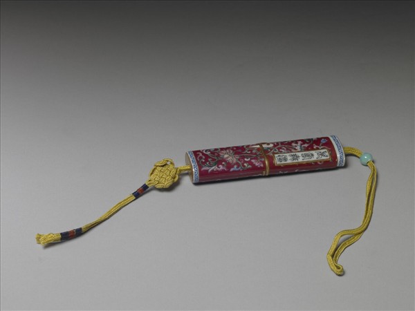 瓷牙籤筒,筒作扁圓形,中空以裝牙籤,外壁彩繪飾纏枝花卉圖樣。一端可打開為器蓋,蓋上穿繩,接貫器底,出為黃結子下垂二繩,蓋上絲繩帶一湖綠瓷珠,絲繩以固定、調整器蓋的開闔。整器外型模仿已收束齊整之畫卷,故器外壁中央繪有金線繞旋與白色別子,兩端白地飾藍色卷草紋一圈以示手卷之鑲邊。除此之外,外壁滿飾紅地纏枝番蓮,有如一卷包首華麗的手卷。又右上有長方形金框榜題,作黑色「萬壽無疆」四篆字,由此推測此器或是為祝壽而製作之物。