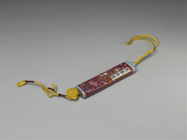 瓷牙籤筒,筒作扁圓形,中空以裝牙籤,外壁彩繪飾纏枝花卉圖樣。一端可打開為器蓋,蓋上穿繩,接貫器底,出為黃結子下垂二繩,蓋上絲繩帶一湖綠瓷珠,絲繩以固定、調整器蓋的開闔。整器外型模仿已收束齊整之畫卷,故器外壁中央繪有金線繞旋與白色別子,兩端白地飾藍色卷草紋一圈以示手卷之鑲邊。除此之外,外壁滿飾紅地纏枝番蓮,有如一卷包首華麗的手卷。又右上有長方形金框榜題,作黑色「萬壽無疆」四篆字,由此推測此器或是為祝壽而製作之物。