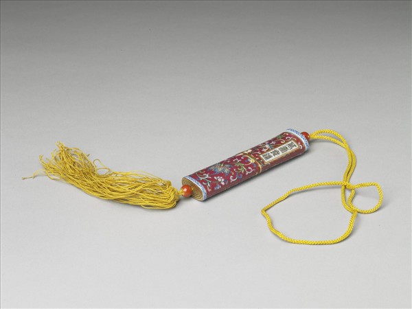 瓷牙籤筒,筒作扁圓形,中空以裝牙籤,外壁彩繪纏枝花卉圖樣。一端可打開為器蓋,蓋上穿繩,接貫器底,出為絲穗,以固定、調整器蓋的開闔。整器外型模仿已收束齊整之畫卷,故器外壁中央繪有以金線繞旋的白色別子,兩端以白地藍色卷草紋一圈以示手卷之鑲邊。器身外壁滿飾紅色底釉和纏枝番蓮紋,有如一卷包首華麗的手卷。又右上有長方形金框榜題,作黑色「萬壽無疆」四篆字。
