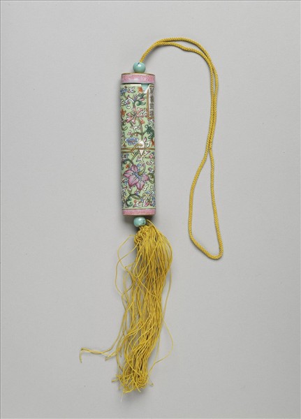 瓷牙籤筒,筒作扁圓形,中空以裝牙籤,外壁彩繪纏枝花卉圖樣。一端可打開為器蓋,蓋上穿繩,接貫器底,出為絲穗,以固定、調整器蓋的開闔,口緣有缺損。整器外型模仿已收束齊整之畫卷,故器外壁中央繪有以金線繞旋的白色別子,兩端以白釉為地再裝飾紅色回紋一圈以示手卷之鑲邊。除此之外,外壁滿飾草綠色底釉和纏枝番蓮紋,有如一卷包首華麗的手卷。又右上有長方形金框榜題,作黑色「萬壽無疆」四篆字。