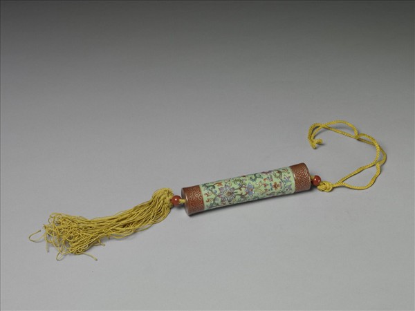 瓷牙籤筒,作圓筒形,中空以裝牙籤,外壁彩繪纏枝花卉圖樣。一端可打開為器蓋,蓋上穿繩,接貫器底,出為絲穗,以固定、調整器蓋的開闔。上下兩端以紅釉為地再裝飾金色卷草花紋一圈。器身外壁滿飾草綠色底釉和纏枝番蓮紋。