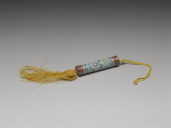 瓷牙籤筒,作圓筒形,中空以裝牙籤,外壁彩繪纏枝花卉圖樣。一端可打開為器蓋,蓋上穿繩,接貫器底,出為絲穗,以固定、調整器蓋的開闔。上下兩端以紅釉為地再裝飾一圈金色卷草花紋。中央器身滿飾湖綠色底釉和纏枝番蓮紋,其間並有金彩「壽」字與桃實,傳達整件作品具有長壽的象徵意涵。