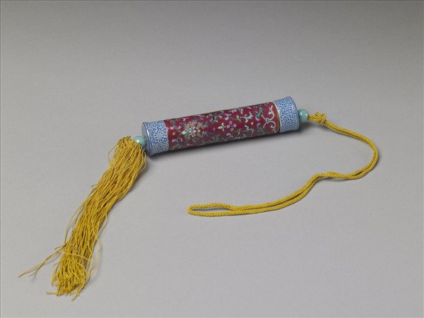 瓷牙籤筒,作圓筒形,中空以裝牙籤,外壁彩繪纏枝花卉圖樣。一端可打開為器蓋,蓋上穿繩,接貫器底,出為絲穗,以固定、調整器蓋的開闔。上下兩端以白釉為地再裝飾一圈藍色卷草花紋。中央器身外壁滿飾紅色底釉和纏枝番蓮紋。