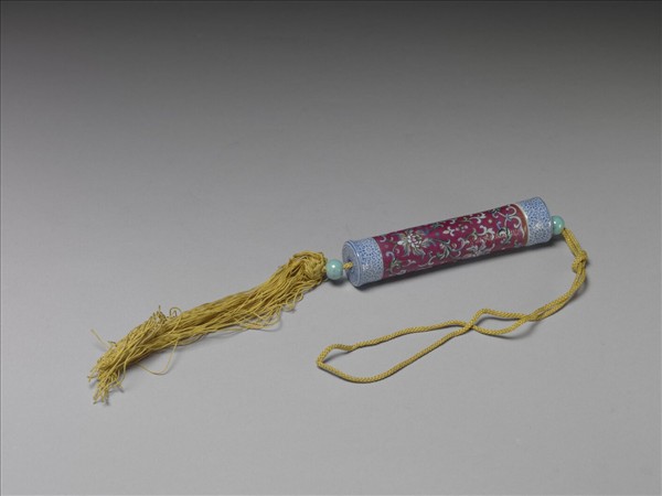 瓷牙籤筒,作圓筒形,中空以裝牙籤,外壁彩繪纏枝花卉圖樣。一端可打開為器蓋,蓋上穿繩,接貫器底,出為絲穗,以固定、調整器蓋的開闔。上下兩端以白釉為地再裝飾一圈藍色卷草花紋。中央器身外壁滿飾紅色底釉和纏枝番蓮紋。