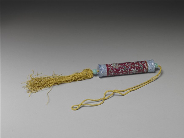 瓷牙籤筒,作圓筒形,中空以裝牙籤,外壁彩繪纏枝花卉圖樣。一端可打開為器蓋,蓋上穿繩,接貫器底,出為絲穗,以固定、調整器蓋的開闔。上下兩端以白釉為地再裝飾一圈藍色卷草花紋。中央器身外壁滿飾紅色底釉和纏枝番蓮紋。