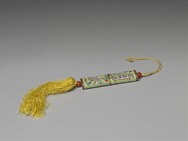 瓷牙籤筒,筒作扁圓形,中空以裝牙籤,外壁彩繪纏枝花卉圖樣。一端可打開為器蓋,蓋上穿繩,接貫器底,出為絲穗,以固定、調整器蓋的開闔。整器外型模仿已收束齊整之畫卷,故器外壁中央繪有金線繞旋與白色別子,兩端以紅釉地金色卷草紋一圈以示手卷之鑲邊。除此之外,外壁滿飾草綠色底釉和纏枝番蓮紋,有如一卷包首華麗的手卷。又右上有長方形金框榜題,作「萬壽無疆」四篆字。