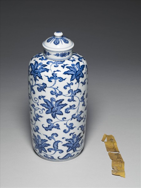 小圓口、短直頸、豐肩、深壁直下,器身呈圓筒狀,淺凹足,帶圓鈕拱形蓋。全器以青花描繪紋飾,頸部飾勾雲紋一周,器身滿佈纏枝花卉紋。底邊飾弦紋兩道。蓋鈕飾朵花紋,蓋面有蓮瓣紋與弦紋兩道。底書「大清雍正年製」青花六字二行楷款,外加雙圈。