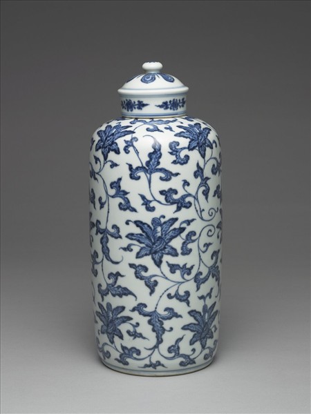 小圓口、短直頸、豐肩、深壁直下,器身呈圓筒狀,淺凹足,帶圓鈕拱形蓋。全器以青花描繪紋飾,頸部飾勾雲紋一周,器身滿佈纏枝花卉紋。底邊飾弦紋兩道。蓋鈕飾朵花紋,蓋面有蓮瓣紋與弦紋兩道。底書「大清雍正年製」青花六字二行楷款,外加雙圈。