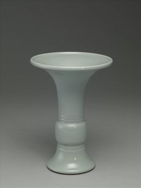 器形仿青銅器觚形,喇叭口外敞,器腹略鼓,足高且外撇。通體施淡青色釉,釉汁瑩厚。腹部上下各飾弦紋二道。圈足塗赭色護胎釉,著地處之赭汁有磨損,露出潔白胎色。足內滿施淡青色釉,並有「大清乾隆年製」青花三行六字篆款。