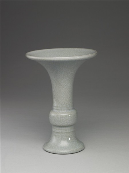 器形仿青銅器觚形,喇叭口外敞,鼓腹,足高且外撇。釉色淡青色帶灰,釉汁瑩厚,全器滿佈細小開片。腹部上下各飾弦紋二道。圈足塗淺赭色護胎釉。足內滿施淡青色釉,並有「大清乾隆年製」青花三行六字篆款。