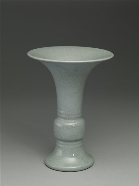 器形仿青銅器觚形,喇叭口外敞,鼓腹,足高且外撇。釉色淡青,釉汁瑩厚,全器滿佈細小開片。腹部上下各飾弦紋二道。圈足露胎,塗淺赭色護胎釉。足內滿施淡青色釉,並有「大清乾隆年製」青花三行六字篆款。
