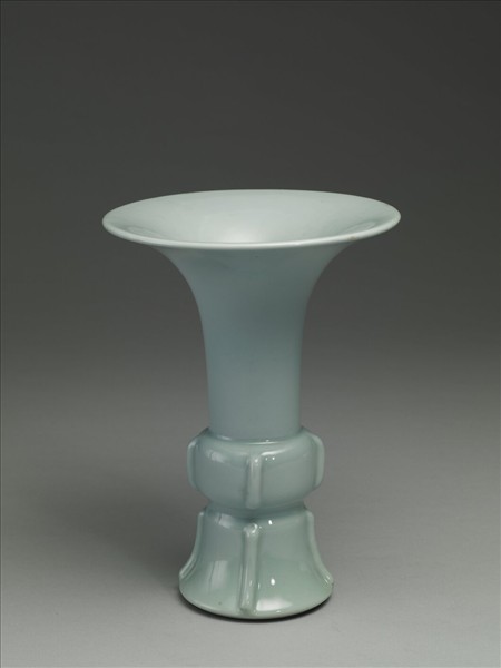器形仿青銅器觚形,喇叭口,短頸,扁鼓腹,足高且向外撇。通體施青釉,釉汁瑩厚。腹部與足部各飾起線直楞紋四道。圈足露胎,塗赭色護胎釉。圈足內亦滿施青釉,並有「大清乾隆年製」青花三行六字篆款。