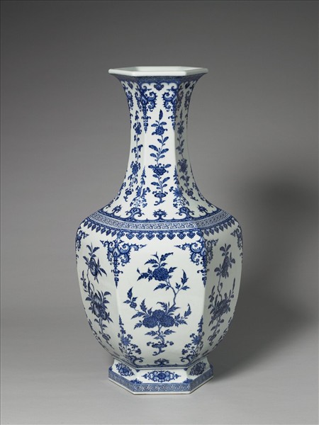 器作六方瓶形,撇口,長頸,斜折肩,直長腹下斂,六邊形圈足略外撇。以青花為飾,口緣飾回紋一周,下接如意雲紋,頸部畫纏枝番蓮。肩部有卍字不斷紋一周,腹部六面各畫折枝番蓮、石榴、桃實與佛手。足部飾花卉圖案與回紋。底以青花書「大清乾隆年製」六字篆款,足底緣露胎。