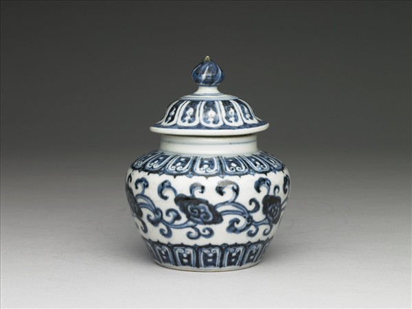 斂圓口,短直頸,豐肩,碩腹,直至底部稍斂,底呈雙階式形,平底。器腹主紋為轉枝靈芝紋,上下各畫典型宣德仰覆蓮瓣一周,口、底邊加飾青線三道。蓋鈕呈一蓮苞狀,蓋面飾蓮瓣紋。青釉濃重,多帶褐綠疵斑,蓋鈕尤其明顯,釉面氣泡疏朗明亮。底足一圈露胎無釉,質地堅堅細膩、帶鐵質斑點。器底青花書「大明宣德年製」六字二行楷款,外加雙圈。