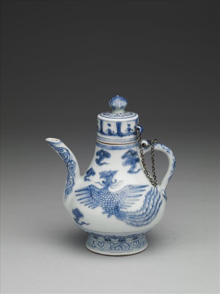 壺,小口,斜肩,垂腹,圈足稍高外撇,曲流,彎把,帶蓮苞鈕平頂直壁蓋,蓋側與流上各有一小圈環,裝一金屬鍊以連結兩者。外壁以青花為飾,壺身兩面各繪一鳳紋,周圍飾雲紋,下緣環繞蓮瓣紋邊飾,流與把皆飾卷草紋,蓮苞鈕及蓋繪飾各種蓮瓣紋,圈足外為卷草紋。足底緣露胎。