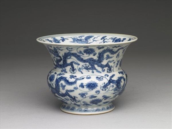 渣斗,喇叭口,寬頸,圓腹,圈足外撇。外壁及口沿內側以青花龍紋為飾,隙地滿繪纏枝番蓮紋,圈足外繪如意雲紋一圈,口沿內外緣及圈足下緣各有兩道弦紋邊飾。圈足底緣露胎呈白色,外底中央以青花書「正德年製」四字雙行楷款,外加雙圈。