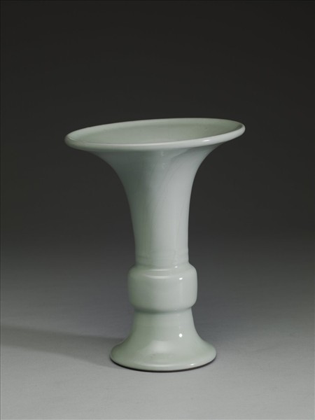 器仿青銅觚形器,喇叭口,長頸,鼓腹,高撇足。通體施青瓷釉,釉汁瑩厚偏淡綠。外壁光素無紋,只在頸部近腹處與足牆近腹部處,各見凸弦紋兩圈。圈足圓緣露胎,塗褐色汁,足內則施青瓷釉,釉下有青花「大清乾隆年製」三行六字篆款。