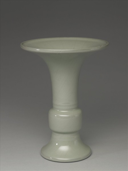 器仿青銅觚形器,喇叭口,長頸,鼓腹,高撇足。通體施青瓷釉,白中偏灰,釉汁瑩厚。外壁光素無紋,只在頸部近腹處與足牆近腹部處,各見凸弦紋兩圈,但因釉厚,故弦紋並不明顯。圈足圓緣露胎,足內則施青瓷釉,釉下有青花「大清乾隆年製」三行六字篆款。