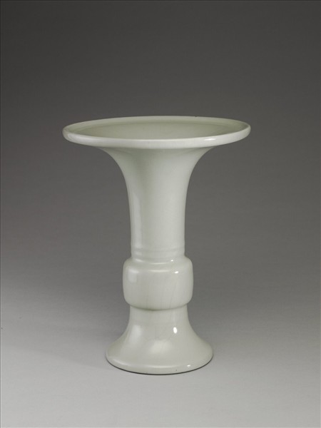 器仿青銅觚形器,喇叭口,長頸,鼓腹,高撇足。通體施青瓷釉,釉汁瑩厚,釉色偏白。外壁光素無紋,只在頸部近腹處與足牆近腹部處,各見凸弦紋兩圈,但因釉厚,故弦紋並不明顯。圈足圓緣露胎,足內則施青瓷釉,釉下有青花「大清乾隆年製」三行六字篆款。