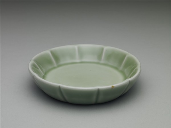 筆洗,十瓣花口,深壁略外弧而下斂,平底內凹成足。口緣隨瓣形略凹,外壁亦隨瓣形刻陷凹痕,並將外壁分割為十等分,除此凹痕外,外壁光素無紋。器內外施罩青釉,色偏淺翠綠,積釉處呈色較深。底外環形無釉墊燒區,中心圓形區內凹,施白釉並以鈷藍釉書「大清康熙年製」三行六字楷款。