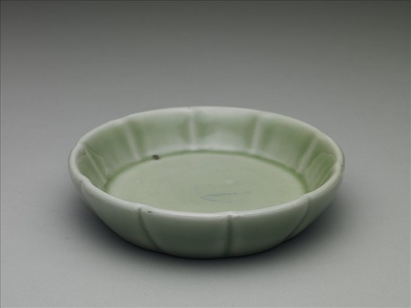 筆洗,十瓣花口,深壁略外弧而下斂,平底內凹成足。口緣隨瓣形略凹,外壁亦隨瓣形刻陷凹痕,並將外壁分割為十等分,除此凹痕外,外壁光素無紋。器內外施罩青釉,色偏淺翠綠,積釉處呈色較深。底外環形無釉墊燒區,中心圓形區內凹,施白釉並以鈷藍釉書「大清康熙年製」三行六字楷款。