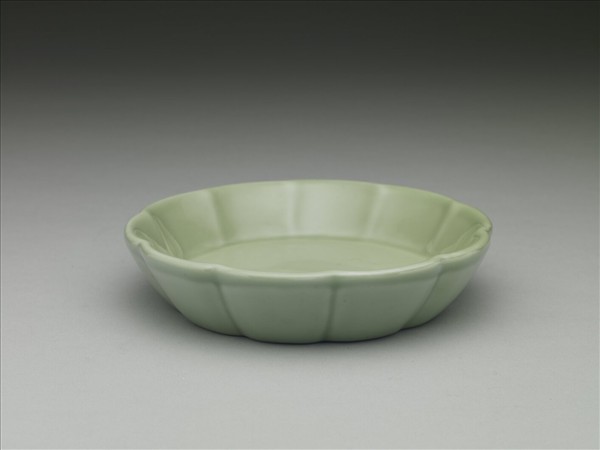 筆洗,十瓣花口,深壁略外弧而下斂,平底內凹成足。口緣隨瓣形略凹,外壁亦隨瓣形刻陷凹痕,並將外壁分割為十等分,除此凹痕外,外壁光素無紋。器內外施罩青釉,色偏淺翠綠,積釉處呈色較深。底外環形無釉墊燒區,中心圓形區內凹,施白釉並以鈷藍釉書「大清康熙年製」三行六字楷款。